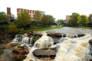 We had a quietly playful day in Greenville. The few times I checked aviation weather for our route, it felt wonderful to be on the ground. It was a refreshing day, after so much flying yesterday, and in such a fun place. Strolling the spiffed up downtown and splashing in puddles, ducking into shops and cafes along the way until we reached the (Reedy?) river again. A heron was patiently fishing next to the rock wall below last night’s restaurant, highlighting how well the city has integrated nature and development.