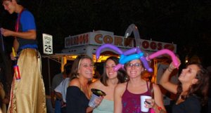Sundown approached as we drew near Tallahassee, so we decided to stop here rather than press on to the corner of AL. As with so many impromptu choices on this trip, it was enchanted. Little did we suspect that tonight is a Big Deal related to team homecoming. Several blocks of the downtown (serendipitously right outside the hotel where we got a good rate) are given over to a festival. At one end a bandstand with cheerleaders and other performing to loud music. An inflated trampoline with Spiderman “dancing” from the kids bouncing inside seemed to keep the beat.