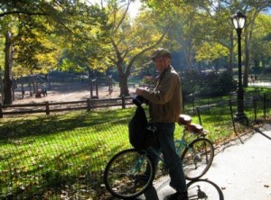 We’re sitting in last night’s hotel room with checkout kindly extended by the front desk, hoping for weather to lift just enough for us to scoot closer to FL. Meanwhile we’ve been browsing the web and our pix from NYC. I just posted one to the Photo page (see Links, upper-right on this page). Since several people have expressed interest in a snap of us riding Central Park, I took another look for one. This is the closest we have, and none of us both actually riding.