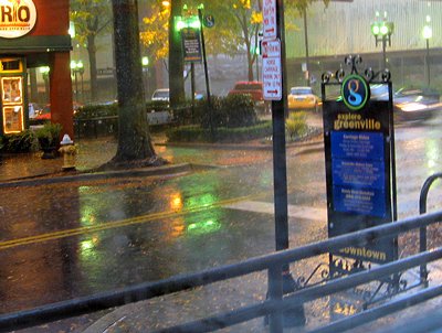 It rained very hard once, but most of the day was light rain and fairly warm. We shot this from today’s dinner choice a couple of blocks away from the river on Main, with a wicked muffin/ice cream/Kahula dessert at Trio across the street.