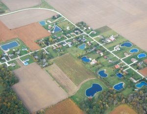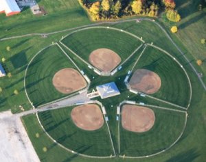 Approaching Akron for the night, we were intrigued by this shape. Looking at the original photo my hunch was confirmed: these are baseball diamonds. Little League perhaps?